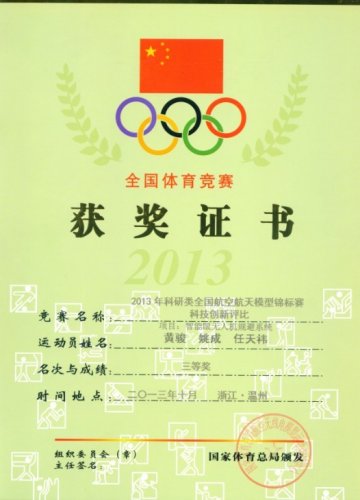 2013年10月在科研类全国航空航天模型锦标赛科技创新评比获三等奖(智能眼无人机规避系统)参赛人:黄骏 姚成 任天伟
