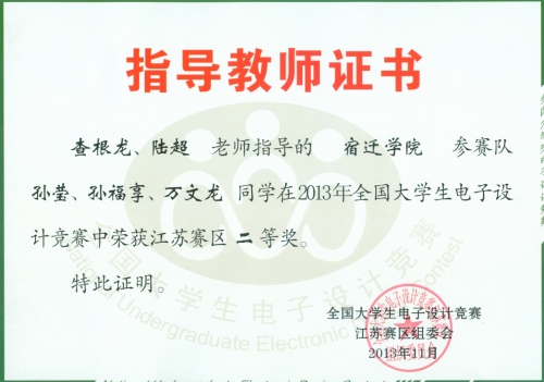 2013年11月在《全国大学生电子设计竞赛(江苏赛区)》中获二等奖,指导老师:陆超 查根龙