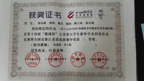 2015年6月我院代表队的《基于LabVIEW的虚拟多功能家居设备遥控器》在第十四届“挑战杯”江苏省大学生课外学术科技作品竞赛江苏省选拔赛中荣获三等奖。