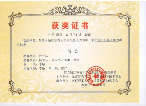 2015年11月我院代表队在第六届江苏省大学生机器人大赛中荣获《水中机器人角力》项目比赛一等奖。
