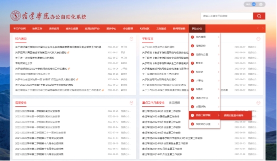 1.登录宿迁学院办公自动化系统,选择下拉菜单“网上办公”点击“信息工程学院”中的“借用实验室申请单”。