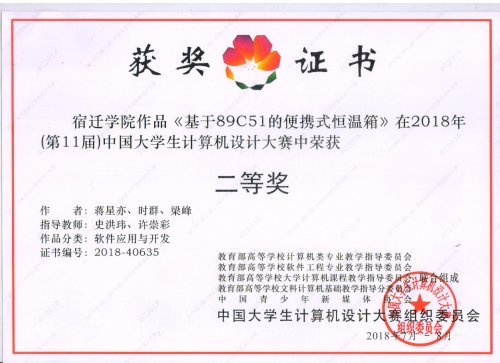 8月16日,2018年中国大学生计算机设计大赛(软件应用与开发类)决赛在上海东华大学举行,我院蒋星亦、时群、梁峰三位同学的作品《基于89C51的便携式恒温箱》经过层层筛选,最终进入决赛,并荣获全国二等奖。 本次比赛指导教师为史洪玮和许崇彩。