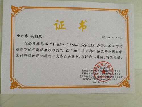 最终,我院李新星、王红侠老师指导的14级材料科学与工程专业学生唐正伟、吴朝政同学的作品《Ti-6.5Al-3.5Mo-1.5Zr-0.3Si合金在不同滑动速度下的干滑动磨损性能》在材料热处理创新创业大赛总决赛中荣获二等奖,并在全国总决赛阶段充分展现了宿迁学院师生优良的精神面貌和扎实的业务能力水平。
