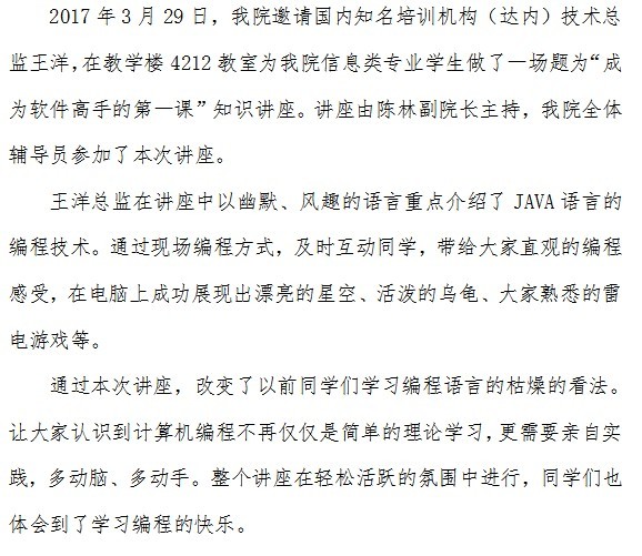2017年3月29日,我院邀请国内知名培训机构(达内)技术总监王洋,在教学楼4212教室为我院信息类专业学生做了一场题为“成为软件高手的第一课”知识讲座。讲座由陈林副院长主持,我院全体辅导员参加了本次讲座。