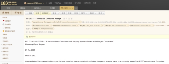 近日,我院朱鹏程博士作为第一作者,我校作为第一单位,与南通大学管致锦教授团队合作完成的学术研究论文《A Variation-Aware Quantum Circuit Mapping Approach Based on Multi-agent Cooperation》被计算机领域国际知名期刊《IEEE Transactions on Computers》录用。该研究首次通过多智能体协同的方法高效且高质量的解决了量子线路向带噪声量子计算设备上的映射问题。
