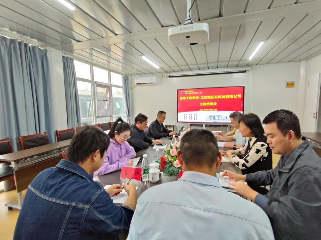 10月12日,我院与江苏鲲跃云科技有限公司洽谈合作,余腾江董事长、孙滔总经理,张岩院长、陈林副院长以及部分系主任、骨干教师参加会谈。