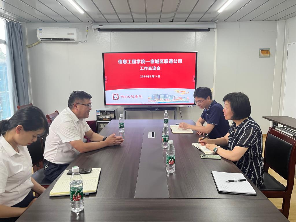 6月14日,中国联通宿城区分公司总经理朱启富来校交流工作。院长张岩、党委书记万娟、副院长陆超等参加相关活动。
