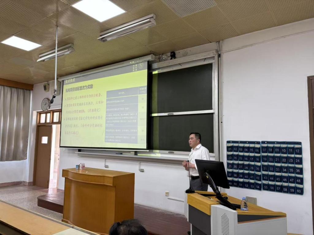 为深入贯彻落实学校新修订的《横向项目及经费管理办法》及《纵向项目及经费管理办法》(2025年修订),切实提升我院科研经费管理规范性与教师报销效率,2025年6月4日下午,学院特邀科技处副处长陈林来院进行专题政策宣讲。本次宣讲会由我院分管科研工作的副院长魏连锁主持,院长张岩和全体教师参加。
