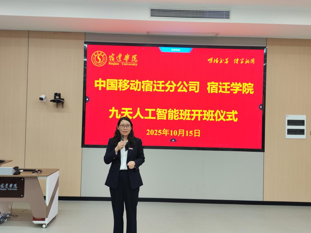 仪式上,郭照冰校长首先代表学校致辞。他深入阐述了开办“九天人工智能班”的背景与重要意义,指出此举主要基于三方面考量:一是契合宿迁学院人才分层分类培养的改革内在需求,旨在为不同专业背景的学生提供个性化、精准化的发展路径;二是积极响应国家大力发展人工智能的战略导向,主动对接前沿科技领域,培养未来产业急需人才;三是深化落实校企合作、产教融合的教育理念,推动教育链、人才链与产业链、创新链的有机衔接。郭校长对入选首届人工智能班的学生寄予厚望,勉励大家要树立远大学习目标,珍惜中国移动提供的优质学习与实践平台,主动加强与移动公司导师、工程师的交流互动,深入了解人工智能技术在中国移动的实际应用场景与所需知识体系;要充分利用企业提供的实践机会,努力将校内所学理论知识与移动公司的实际业务需求紧密结合,做到学以致用、用以促学。同时,郭校长特别强调,班级同学虽来自不同年级、不同专业,但应迅速凝聚成一个团结协作、互助共进的集体,共同致力于将“九天人工智能班”建设好、发展好,努力将其打造成为具有区域影响力、彰显宿迁学院与中国移动宿迁分公司合作特色的标杆班级。