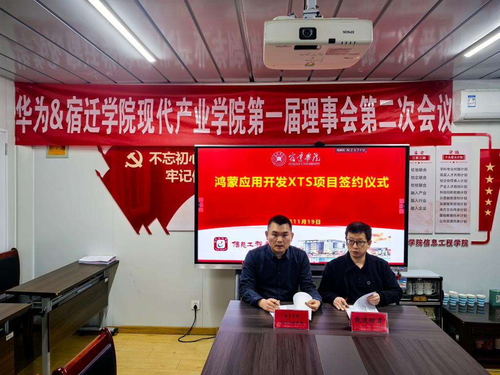 会议伊始,张院长代表产业学院向理事会汇报了近期建设情况,展现了产业学院自成立以来的快速发展与阶段性成果,获得了理事会成员的一致认可。随后,产业学院分别与软通动力信息技术(集团)股份有限公司及江苏万和系统工程有限公司签署了框架合作协议。这两项重要合作的达成,标志着产业学院在汇聚企业资源、共建产教融合共同体方面迈出关键步伐。未来,各方将在技术协同研发、学生实习实训、毕业生就业对接等领域深化合作,形成优势互补、资源共享的新局面,共同为区域数字经济高质量发展注入强劲新动能。为了聚焦前沿技术、推动鸿蒙生态建设与人才培养,学院还与鸿湖万联(江苏)科技发展有限公司正式签署了首期鸿蒙技术开发合作项目协议。此举将为相关专业学生提供宝贵的实践机会与前沿技术视野。