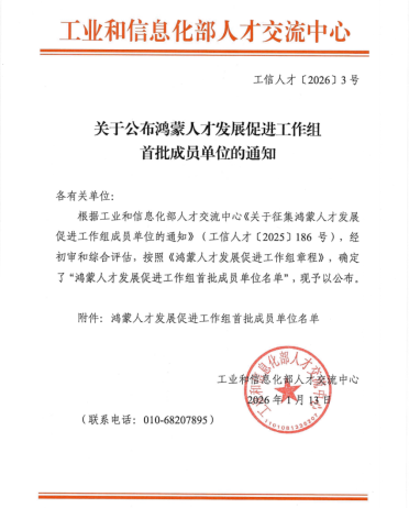 近日,工业和信息化部人才交流中心正式公布“鸿蒙人才发展促进工作组”首批成员单位名单,我校凭借其在鸿蒙生态人才培养方面的扎实基础与突出成果,成功入选首批成员单位,标志着学校在服务国家信息技术应用创新战略、深化产教融合方面迈出重要一步。