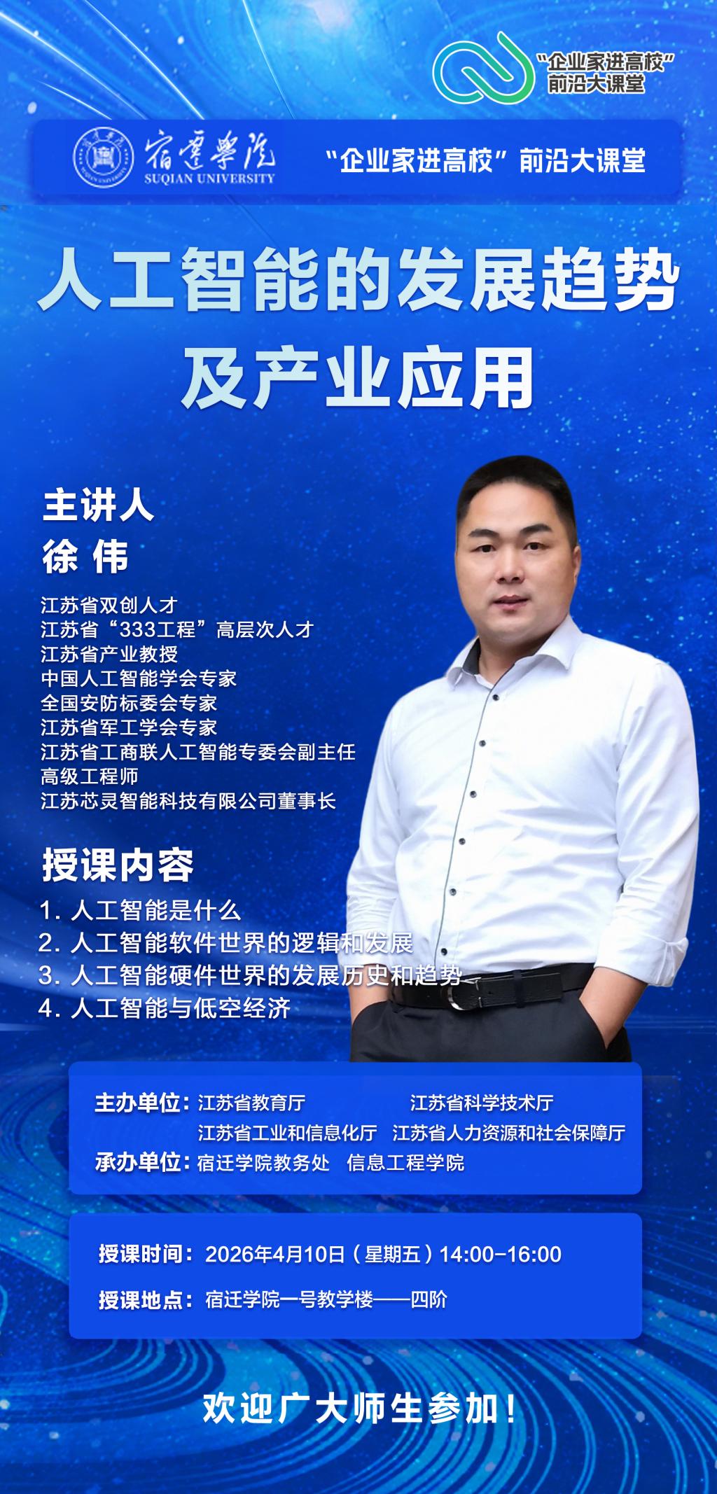 4月10日下午,由江苏省教育厅、省科技厅、省工信厅、省人社厅联合主办,我校教务处、信息工程学院承办的“企业家进高校”前沿大课第一讲在学院一号教学楼第四阶梯教室成功举办。本次讲座特邀江苏省“双创人才”“333工程”高层次人才、江苏省产业教授、江苏芯灵智能科技有限公司董事长徐伟高级工程师,为我校师生带来一场题为《人工智能的发展趋势及产业应用》的前沿学术盛宴。校党委常委、统战部部长、教务处处长陆海霞出席报告会,信息工程学院张岩院长主持报告会。此次会议采取线上直播与线下同步进行,共有百余名师生参会。