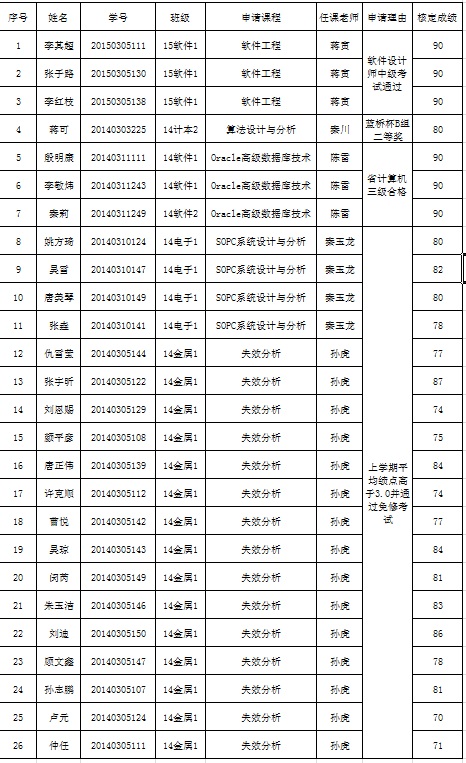 根据信息工程学院免修、免听课程实施方案(试行),经本人申请、并对申请资格进行审核,同意李其超等26名同学的免修申请,现公示如下: