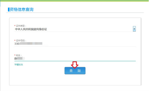 同意报名协议后进入资格信息查询界面,输入本人身份证号码,点击“查询”。
