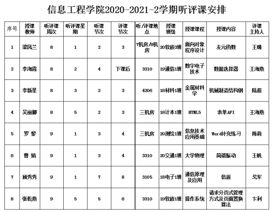 请各位老师根据自己的时间选择听课,每位老师至少参加两节听评课活动,为了维护课堂秩序,请听课老师提前十分钟到达教室,认真听课并积极参加评课。