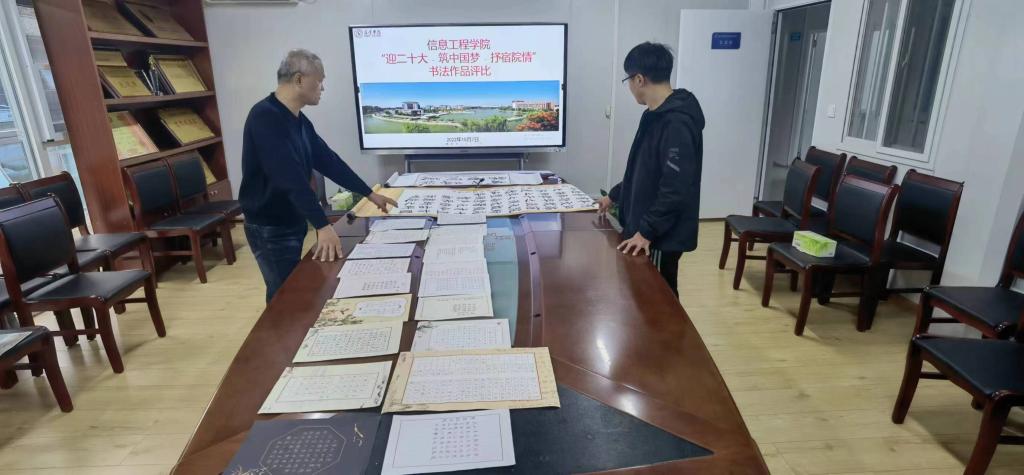 为喜迎党的二十大胜利召开,激发广大学生为实现中华民族伟大复兴中国梦不懈奋斗,自觉传承和弘扬中华书法文化,涵养学生艺术素养,推动学生之间的书法艺术的交流与学习,信息工程学院日前举办了“迎二十大 筑中国梦 抒宿院情”书法比赛,同学们踊跃参与,上交作品106幅。经过初评和专家评审,评选出一等奖2名、二等奖3名、三等奖5名、优秀奖10名。学院将组织获奖学生集体创作,并举办获奖学生优秀作品展。