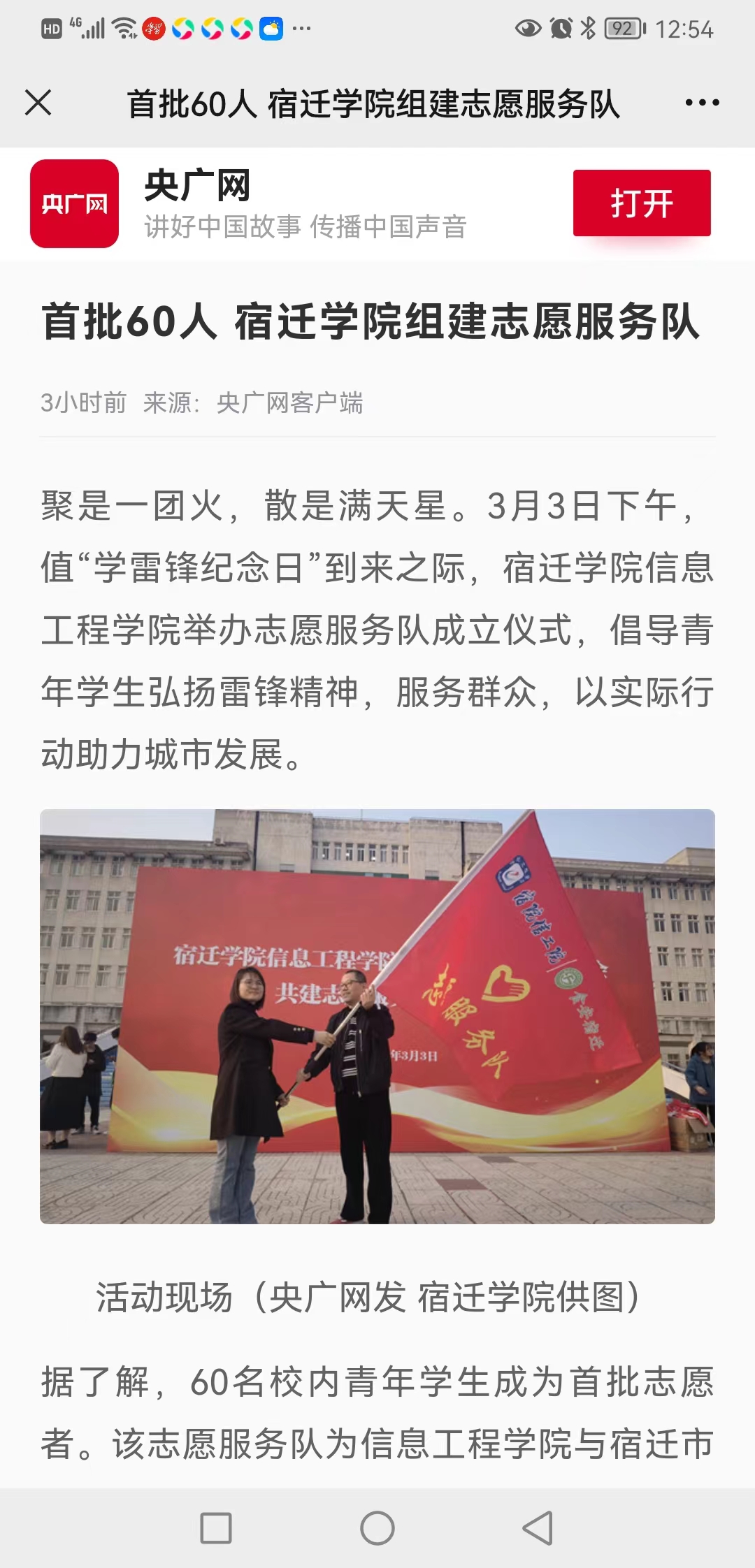 在第60个学雷锋纪念日和第24个中国青年志愿者服务日即将到来之际,为深入学习宣传贯彻党的二十大精神,认真落实习近平总书记在“把雷锋精神代代传承下去——纪念毛泽东等老一辈革命家为雷锋同志题词六十周年”座谈会的重要指示精神,宿迁学院信息工程学院与宿迁市食品安全协会团结带领广大青年学生共建志愿服务队,为构筑全市食品安全防线,推动地方经济社会发展贡献青春力量。