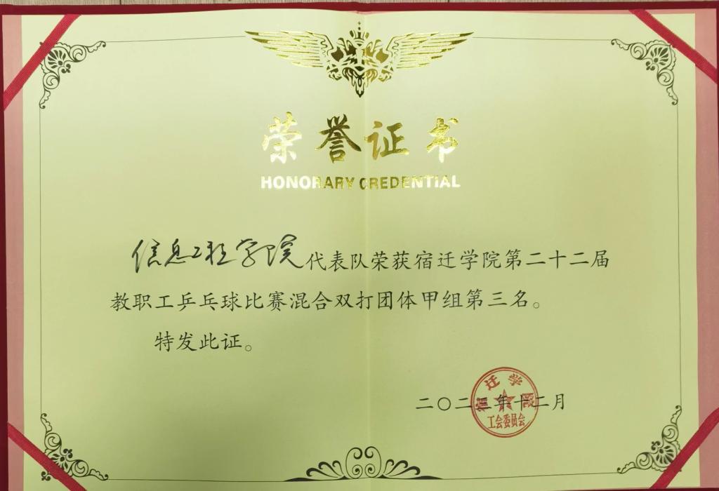 日前,我院代表队荣获宿迁学院第二十二届教职工乒乓球比赛混合双打团体甲组第三名。