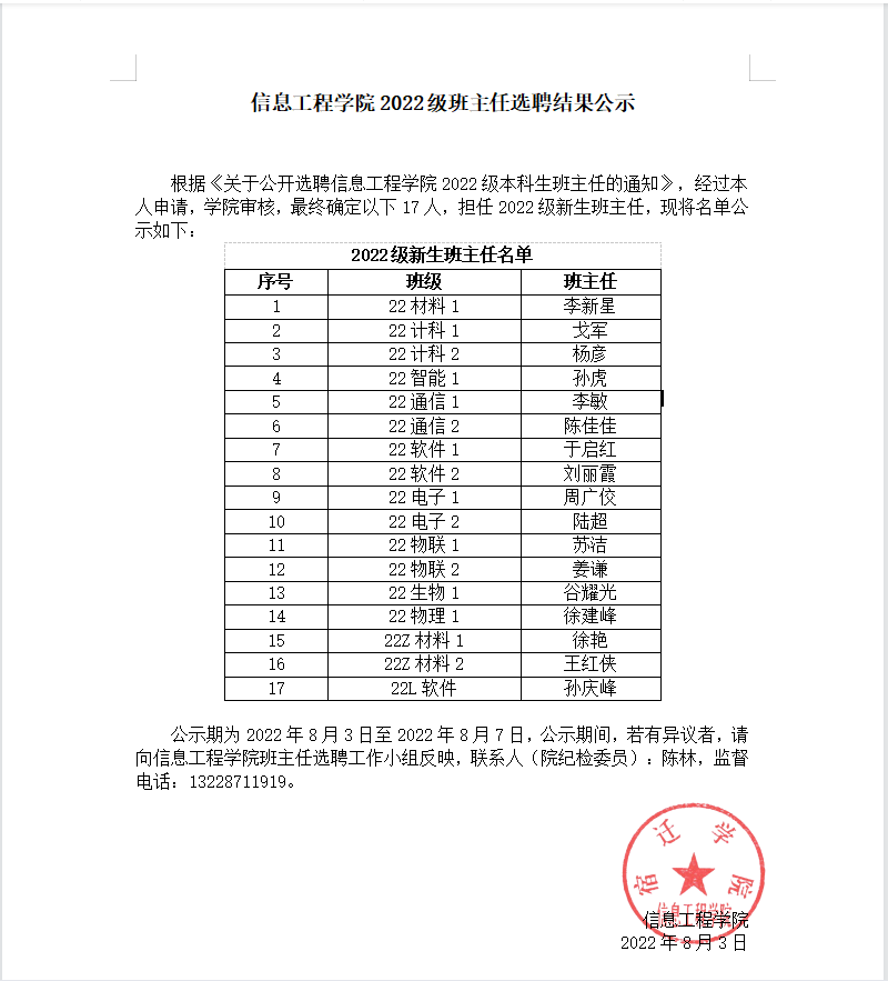 根据《公开选聘信息工程学院2022级本科生班主任的通知》,经过本人申请,学院审核,现将选聘结果公示如下: