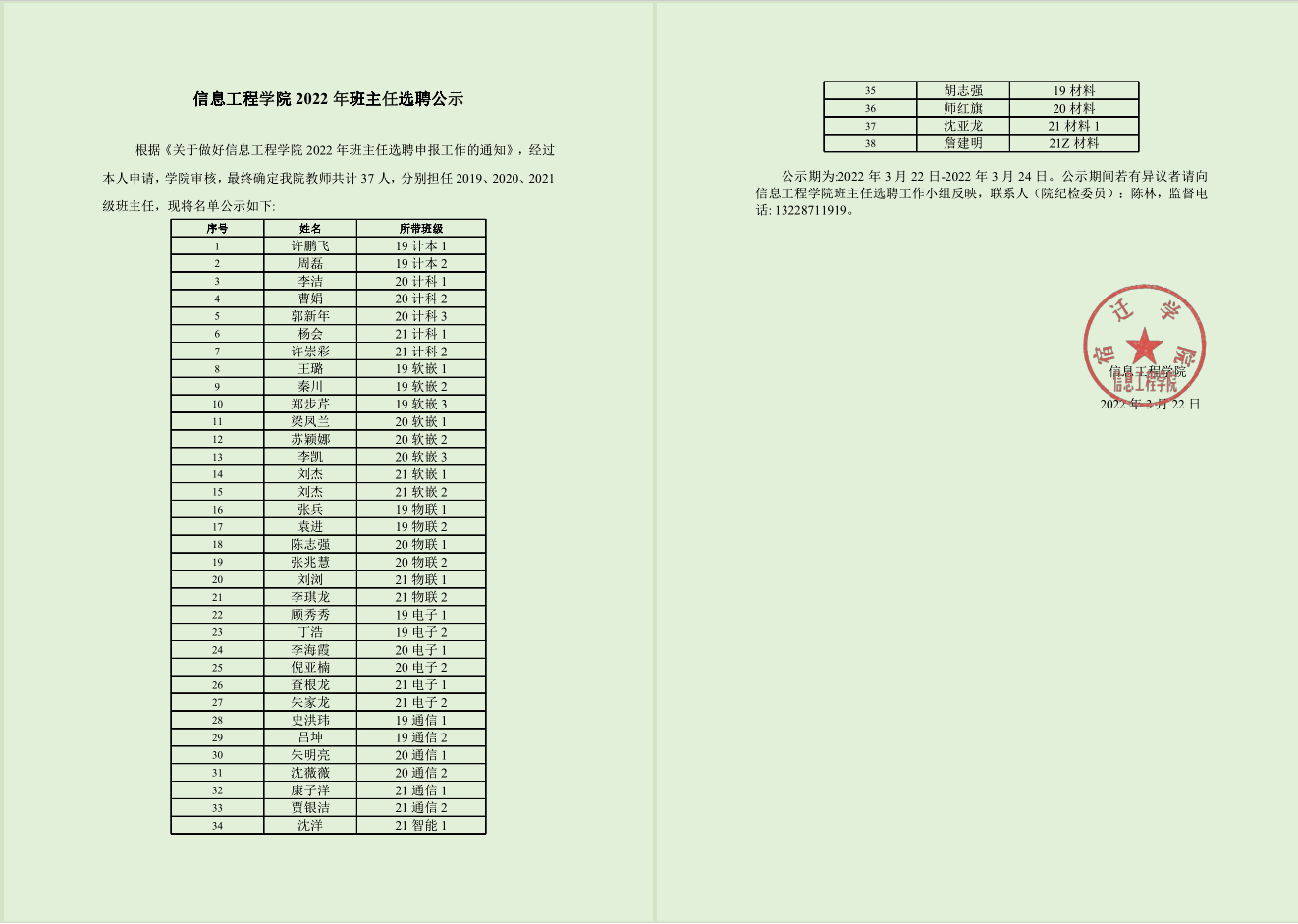 根据《关于做好信息工程学院2022年班主任选聘申报工作的通知》,经过本人申请,学院审核,现将2019、2020、2021级班主任选聘结果公示如下: